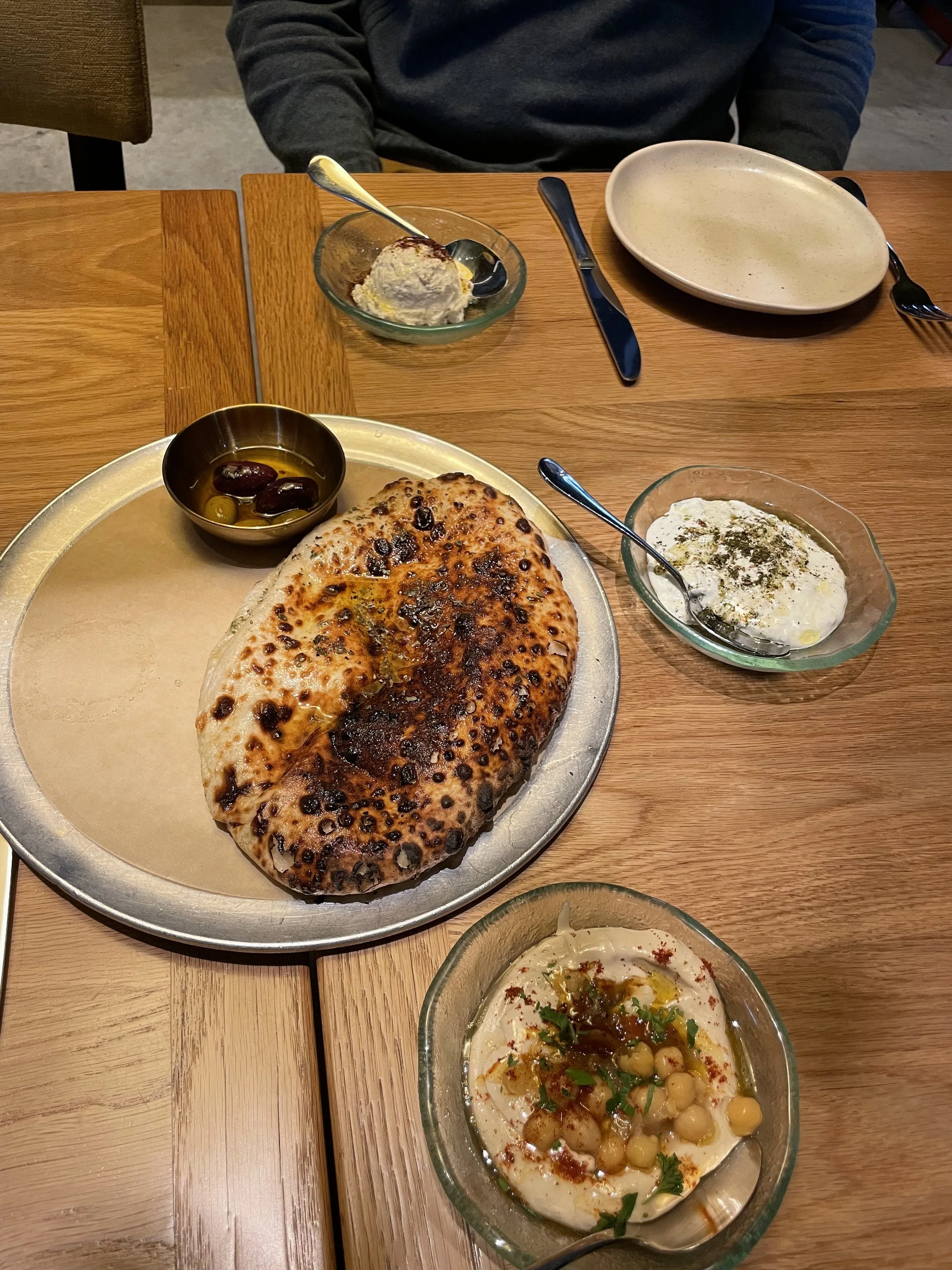 Esh flat bread with three dips: Hummus Tahini, Tzatziki, and Spicy feta [9/10]